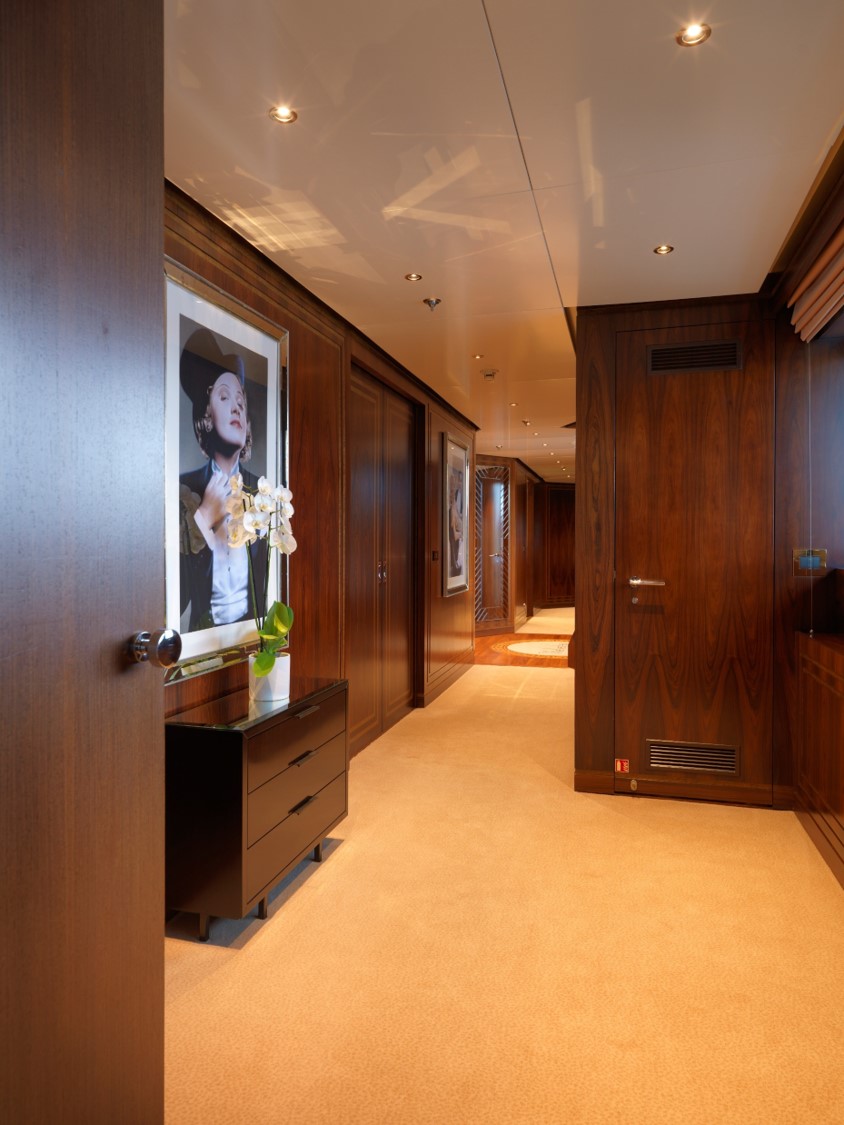 On the main deck, the generous salon offers a relaxed ambience with beautiful soft furnishings. Surrounded by warms woods, panoramic windows and gloss white ceiling with soft lighting, space boasts a soothing retreat or sophisticated gathering place, ideal for any occasion.