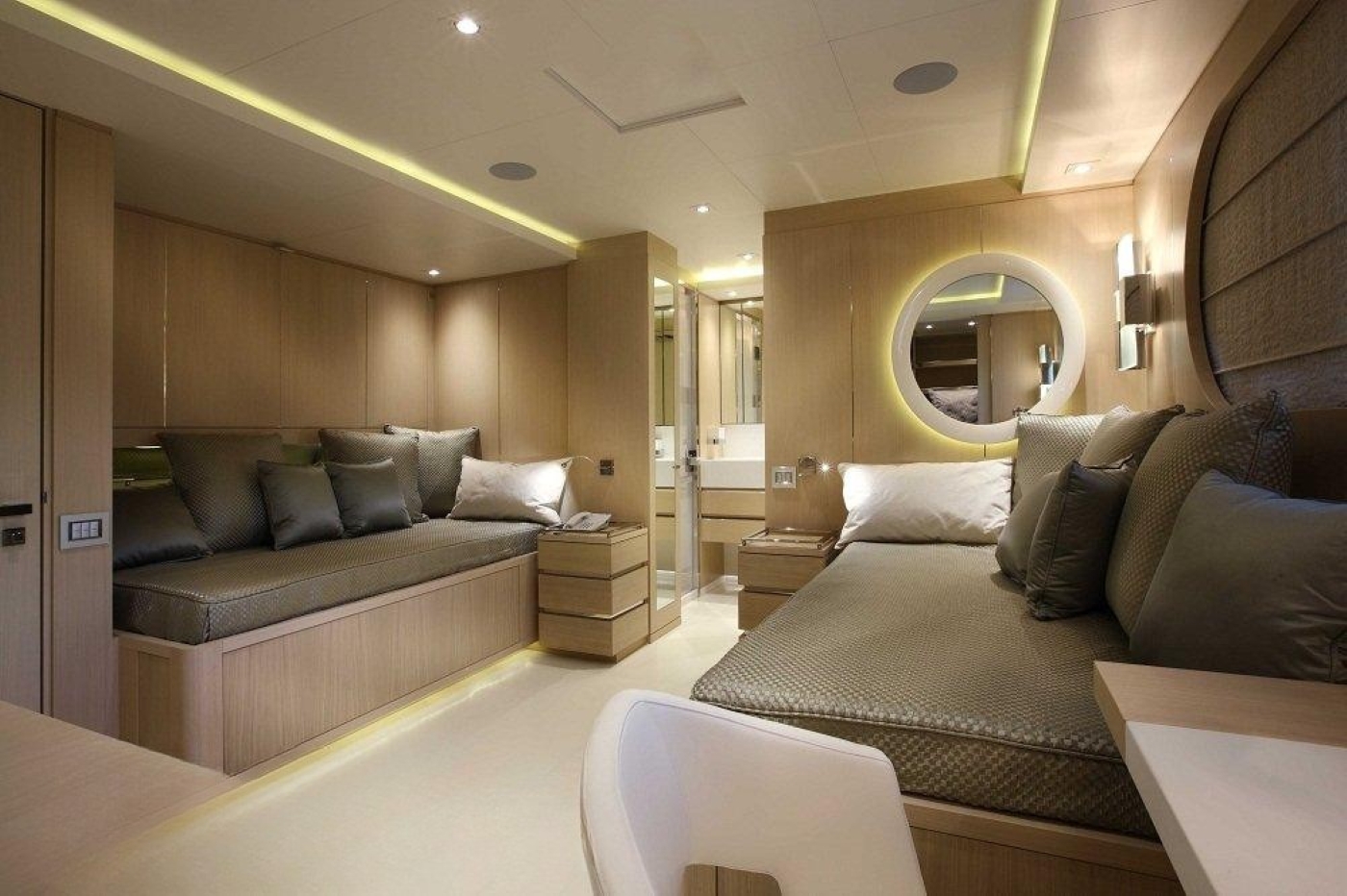 Motor yacht LIGHT HOLIC can accommodate up to 12 guests in six cabins spread over her numerous decks. The beautifully appointed full-width owner’s suite which is located on the main deck enjoys a private balcony. There is a 'presidential suite' on the upper deck and three doubles and a twin on the lower deck.