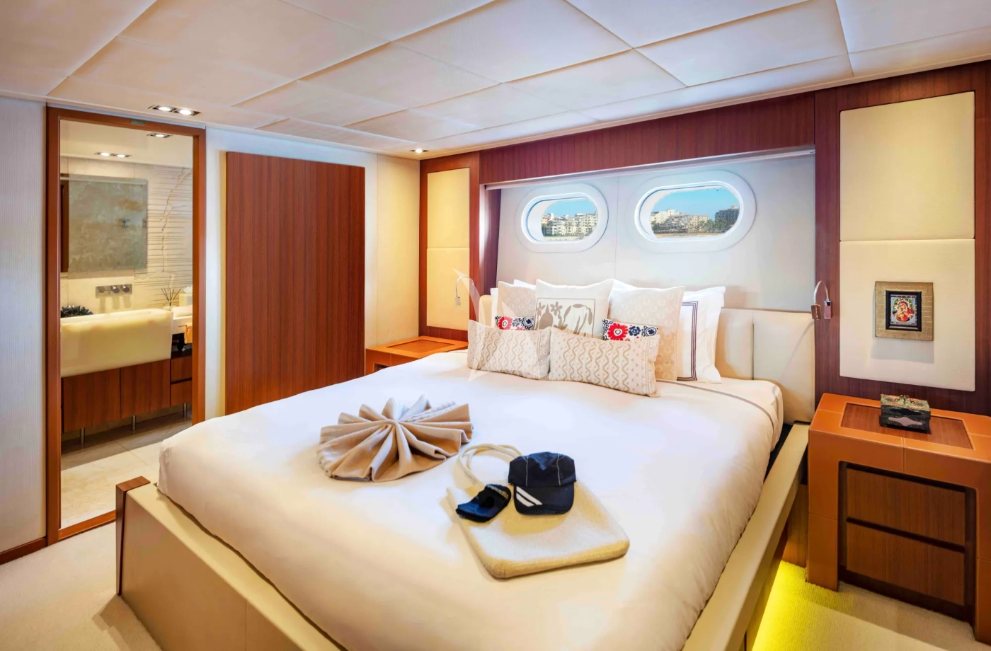 M/Y CHAMPAGNE SEAS is intended to provide every amenity for her active owner family and their guests with a layout including six staterooms and a tender garage which allows for an oversized sundeck complete with workout stations and ample relaxation options.