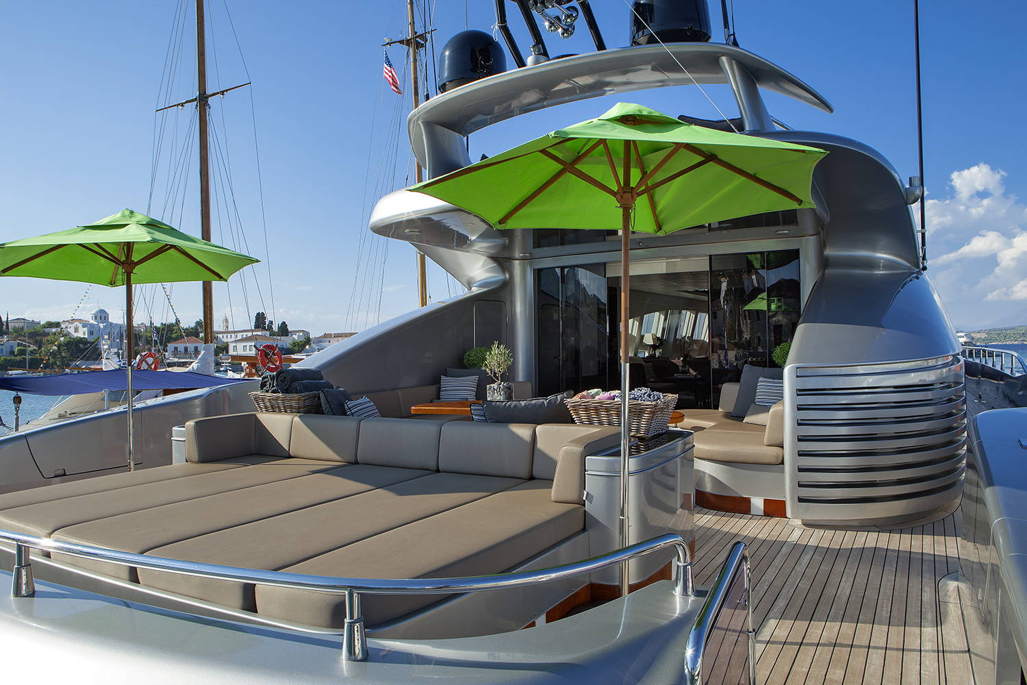 The large open aft deck provides a great spot to dine al fresco or enjoy lounging on the large sun beds.