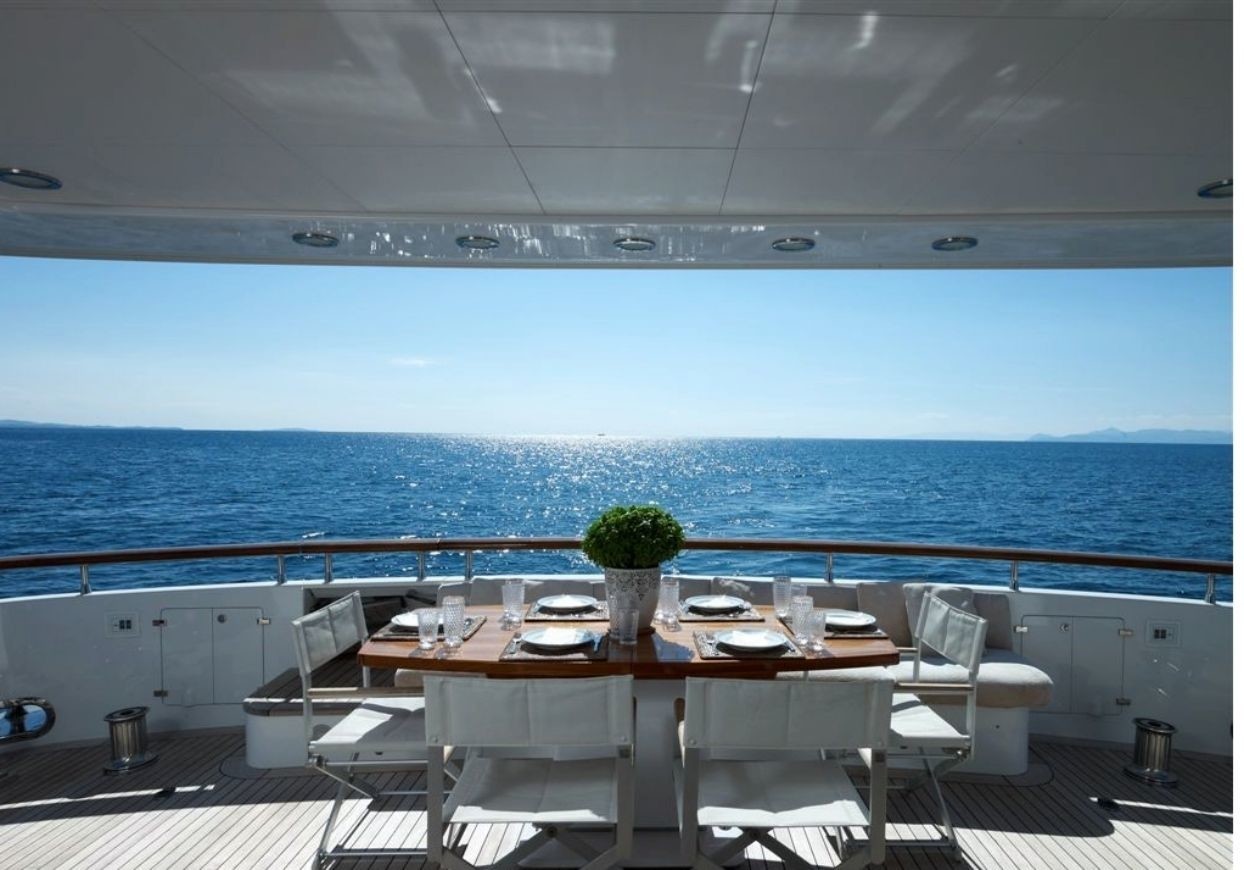 Charter Yacht FELIGO V offers great deck space with 2 alfresco dining areas. The sizeable aft deck is pleasantly shaded offering relaxing seating and alfresco dining.