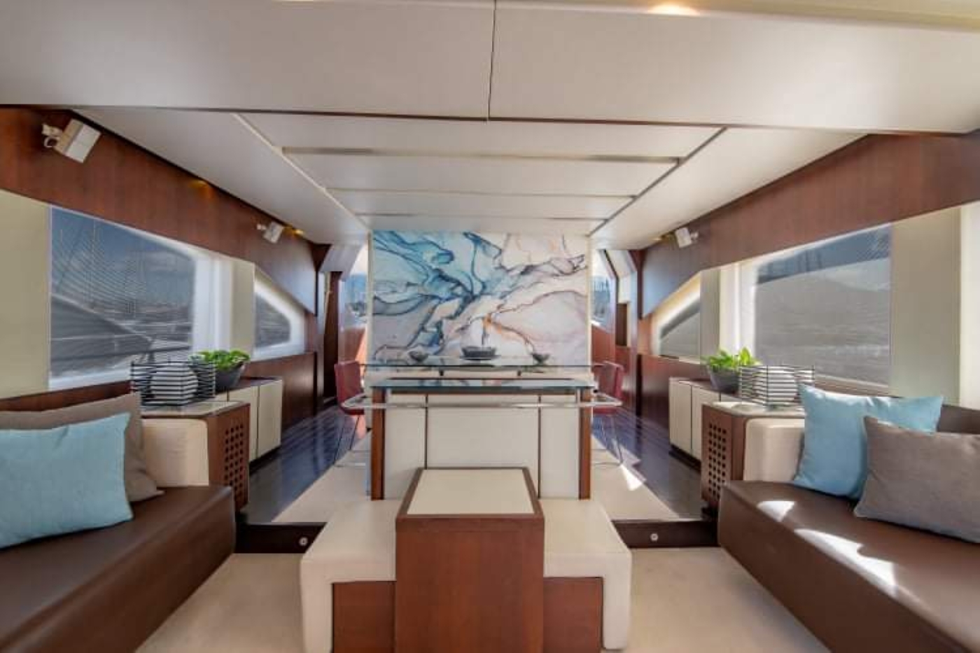 The VIP cabin is equipped with a central double bed, a large closet and a private ensuite bathroom. Two twin cabins are equipped with two individual beds, closet and direct access to a bathroom. The master suite is quite impressive and is aft and full beam.