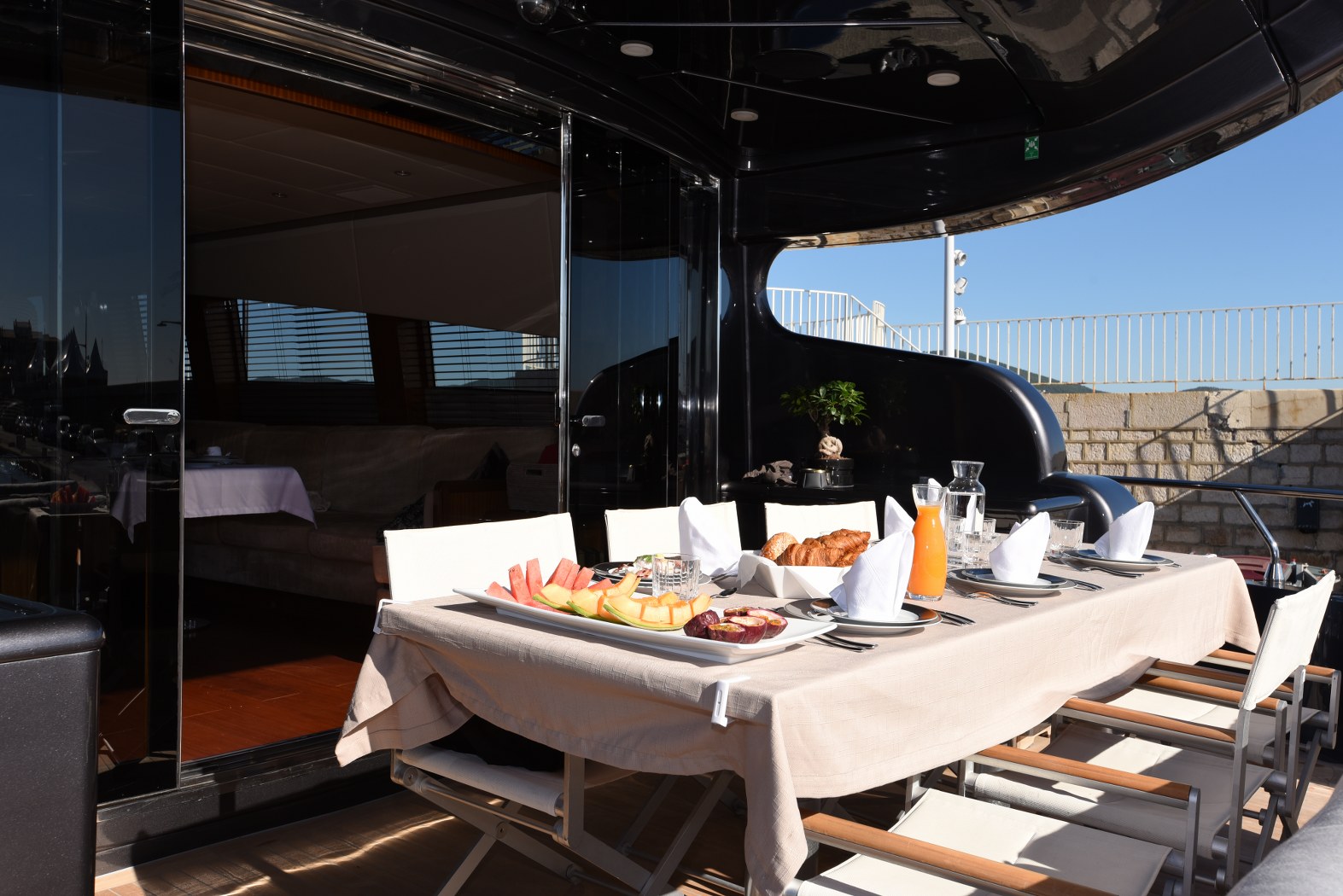 Forward of this sun-drenched lounge on the main deck aft is an alfresco dining table surrounded by eight chairs for casual alfresco dining and lounging in the sunshine or shade while enjoying the local scenery.