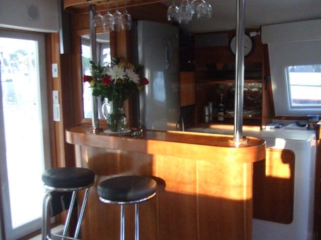 Yacht MANZY has a light and airy main salon with smart navy leather sofa seating around the dining table, and a modern fully equipped galley area further forward.