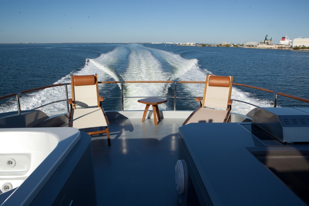 NOTABLE FEATURES: ~ Extended sundeck ~ Shaded aft deck ~ Hot tub on Flybridge ~ Large salon ~ Zero speed stabilization