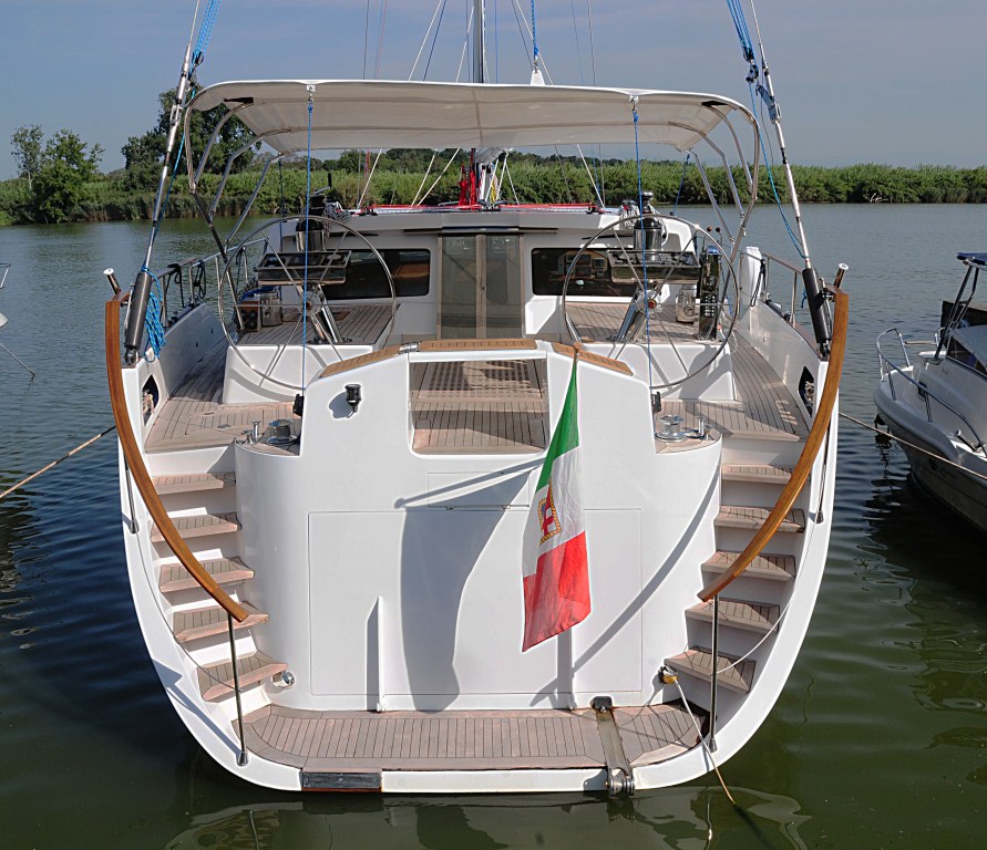 Yacht MYOSOTIS has an aft cockpit with two outdoor benches and a folding table, while a double staircase and deck allow easy access to the sea.
