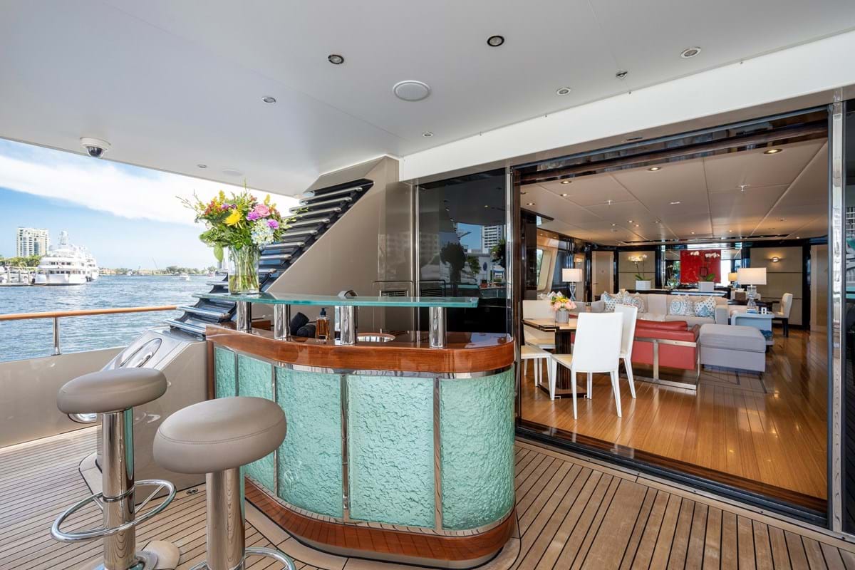 The aft cockpit features a bar on the port side with a 10-seat dining table for alfresco entertaining. The cockpit seating area is protected by the overhang of the flybridge, which can be further extended with a retractable hard ...