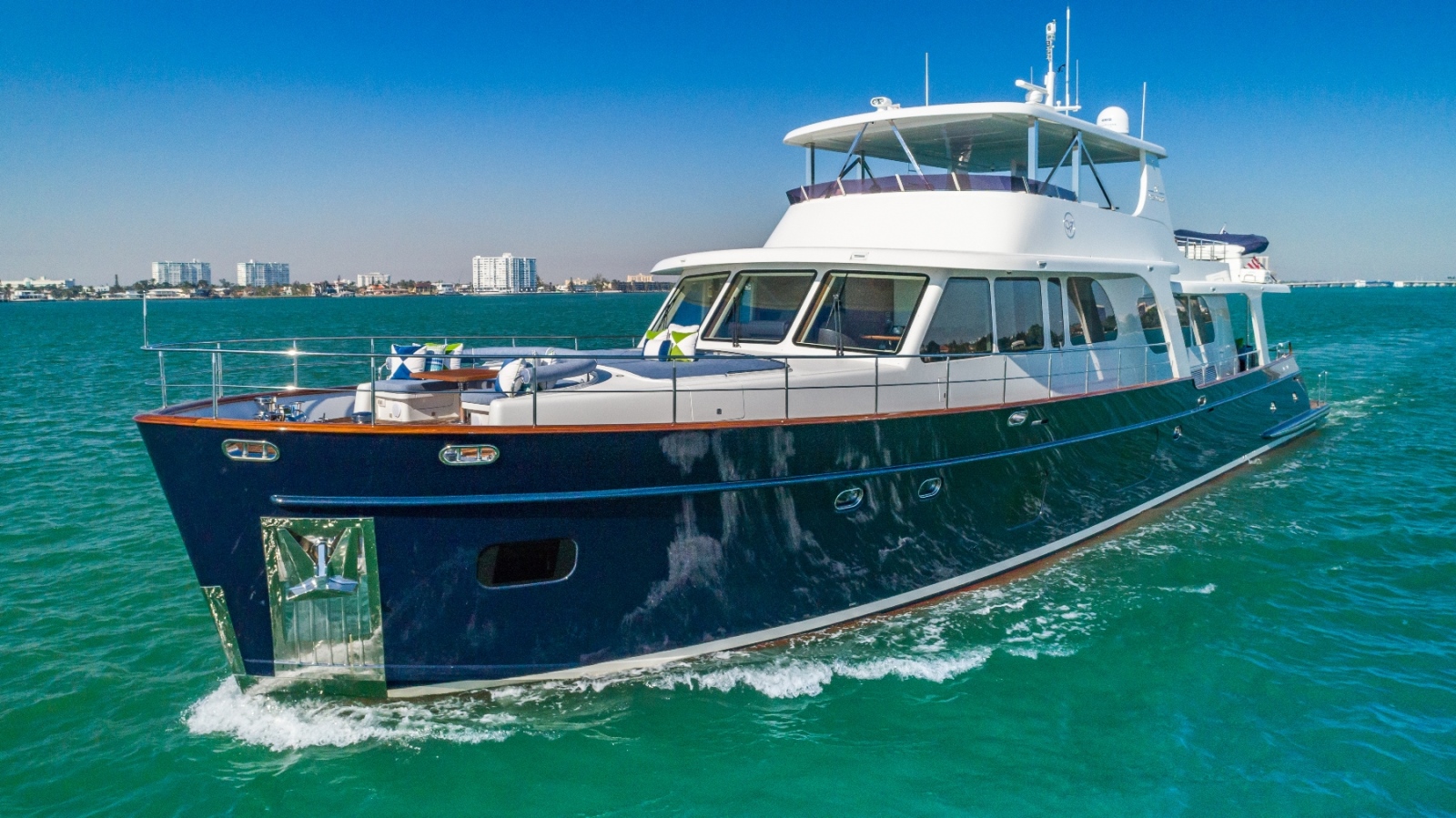 Launched in 2012, the 32.5m motor yacht MONI - Vintage 107 is a luxury cruiser constructed by the Turkish yard, Vicem Yachts. She boasts a deep V semi-displacement blue hull, built in cold moulded mahagony and epoxy as well as a white superstructure.