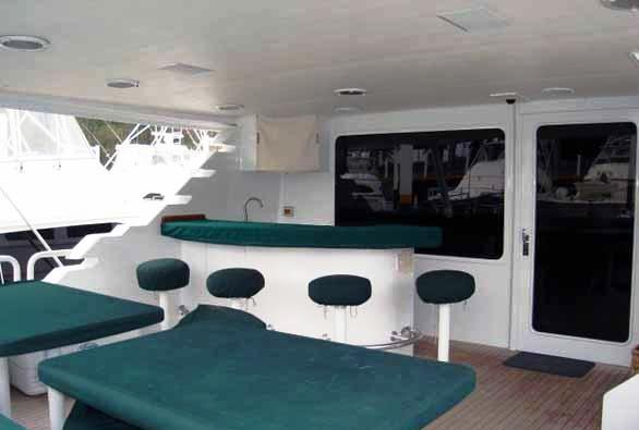 Charter yacht Turnin’ Left has good deck space forward with ample sun pads, and the aft deck has a table and comfortable seating for alfresco dining, with a bar area and stools.