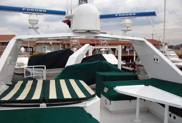 Charter yacht Turnin’ Left has good deck space forward with ample sun pads, and the aft deck has a table and comfortable seating for alfresco dining, with a bar area and stools.