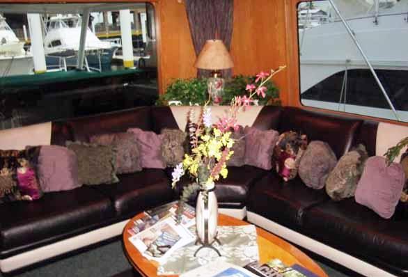 M/Y Turnin’ Left has a traditional interior with wooden cabinets and leather sofas in the main salon, which has a separate dining area further forward.