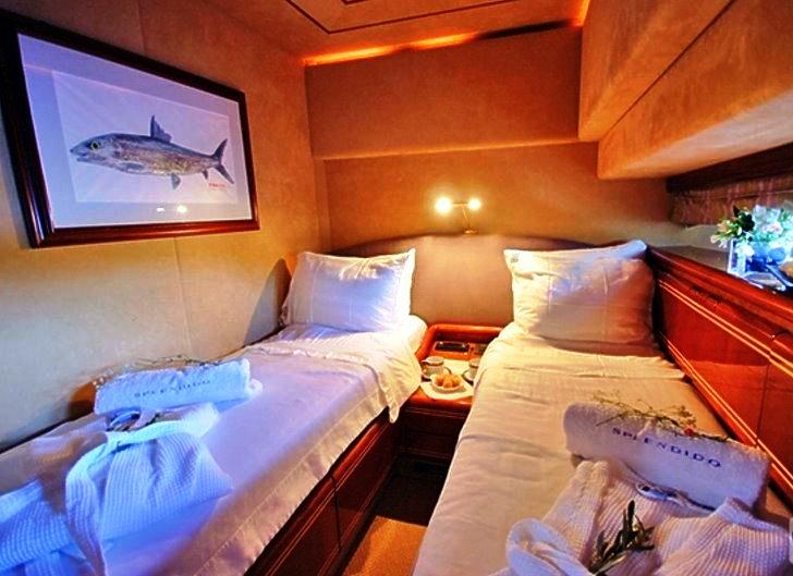 Motor yacht SPLENDIDO can accommodate up to 8 guests in 4 cabins. The full width Master cabin aft has a king size bed, with en suite shower and toilet. A further full width VIP cabin forward has a queen size bed, with en suite shower and toilet.