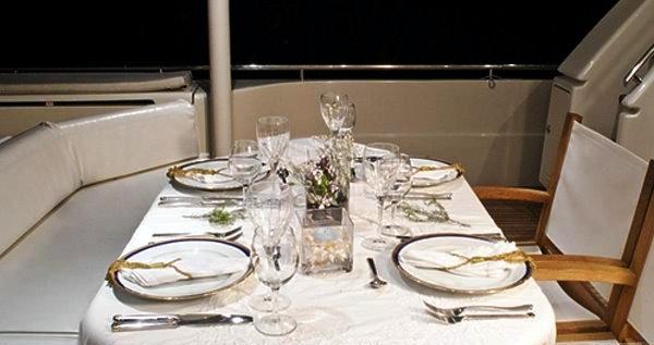 The Splendido motor yacht has good deck space forward with ample sun pads, and the aft deck has a table and comfortable seating for alfresco dining.