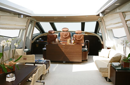 The interior of the luxurious yacht RENA N includes a minimal main salon and abundant entertaining space and seating.