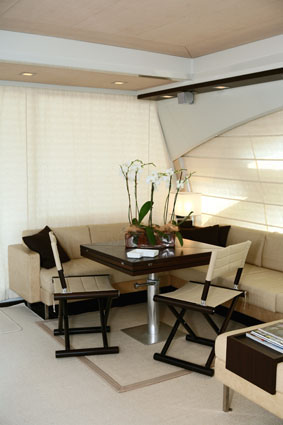 The interior of the luxurious yacht RENA N includes a minimal main salon and abundant entertaining space and seating.