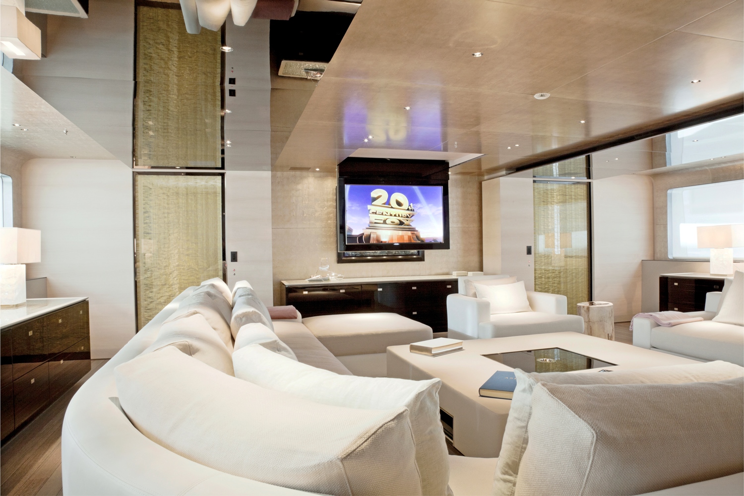 The main salon shares the same pale panelling and goldleaf accents found throughout the accommodation for a laid-back daytime atmosphere and sophisticated night-time ambiance. Guests have a choice of seating for relaxation, games and refreshments from the wet bar.
