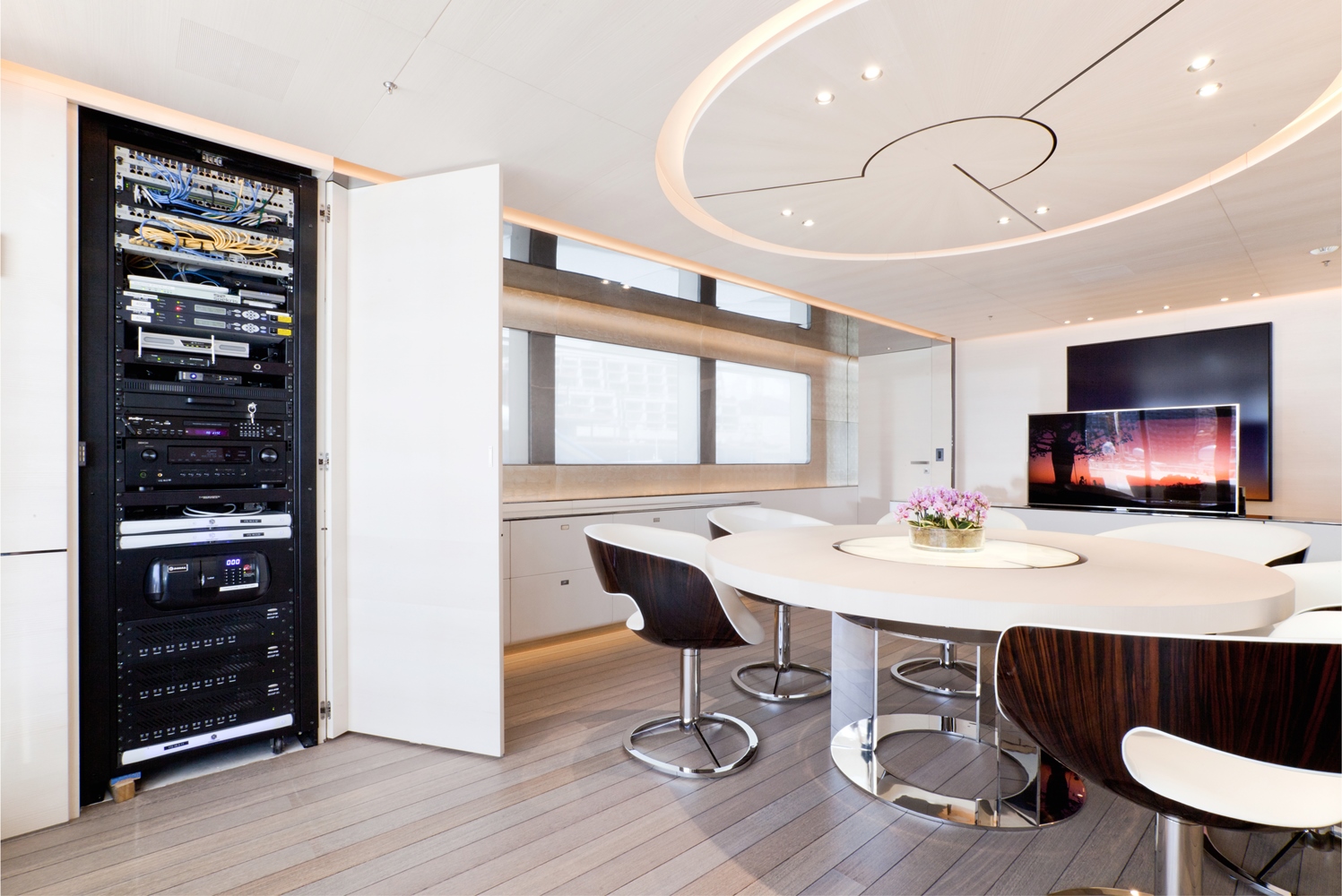 There are also two raised tables, a continuous C-shaped sofa along the stern and four additional chairs for meals and conversation while enjoying elevated views of the surroundings.