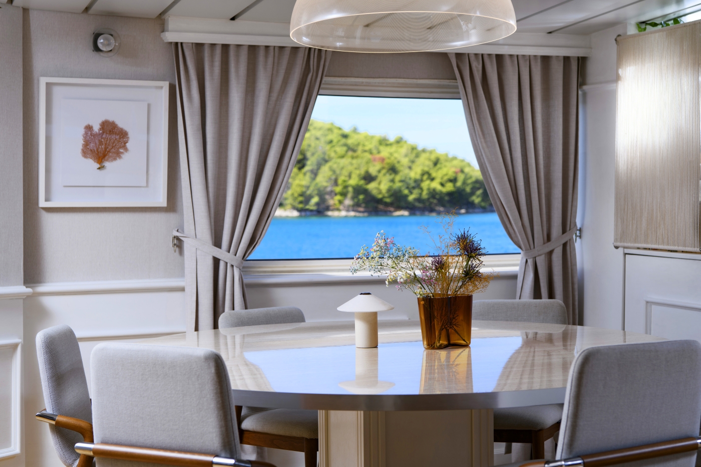 The salon is painted a crisp white with fine trim detail and deep red carpets; there are three formal dining tables, a lounge and bar area with additional seating forward. The oversized windows allow for ample natural light and picturesque views.