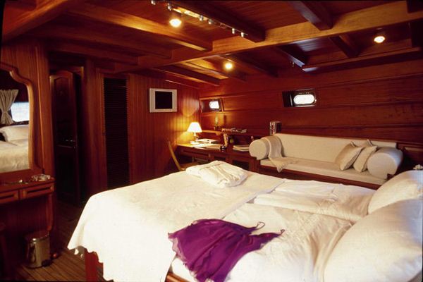 Gulet ED II is able to accommodate up to 8 charter guests in four cabins located on the lower deck. The owner master cabin is at the aft of yacht featuring a king size bed and accentuated wood and leather works that contrast with the natural light streaming in from the large windows.