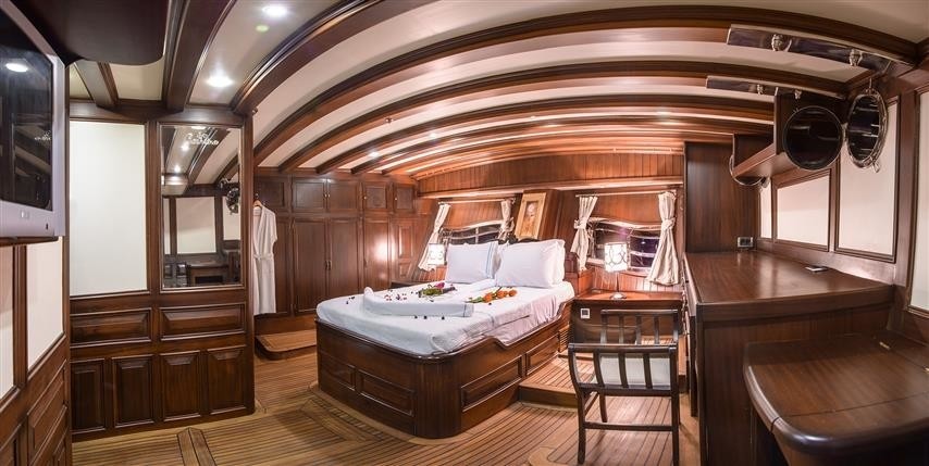 There is a master cabin, a VIP cabin, 3 double cabins as well as a triple cabin, with separate accommodation for a crew of 5, well experienced in vip service as well as customer care. All cabins feature CD and DVD player, along with a TV offered by main saloon. There are ensuite bathrooms with shower cells and vaccum flush toilet.