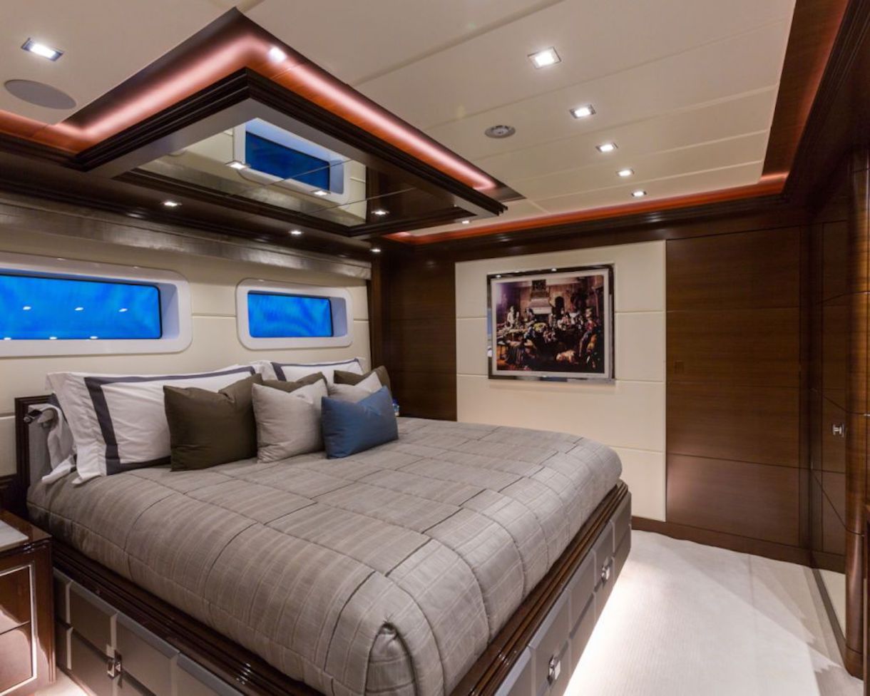 Her main salon features a plush lounge suite with custom-designed coffee tables, easily seating all 12 guests in comfort. On the port side is a white onyx bar with custom oversized leather chairs.
