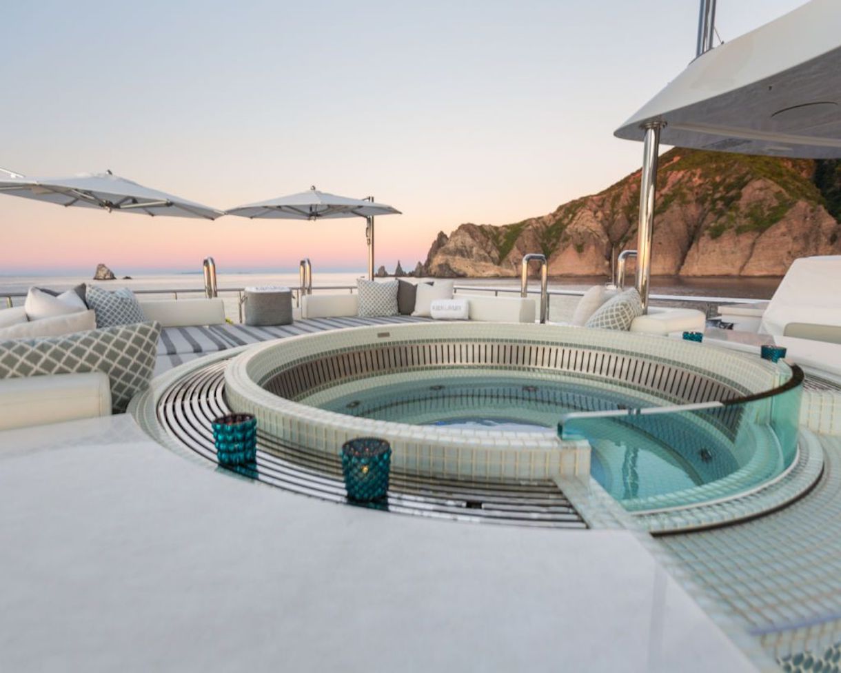 Custom art from iconic music artists is etched into a glass door, which conceals the large wine fridge. Throughout the yachts interior and exterior are state-of-the-art audio and visual systems, ensuring optimum entertainment. Views from the salon and sky lounge are limitless thanks to panoramic windows.