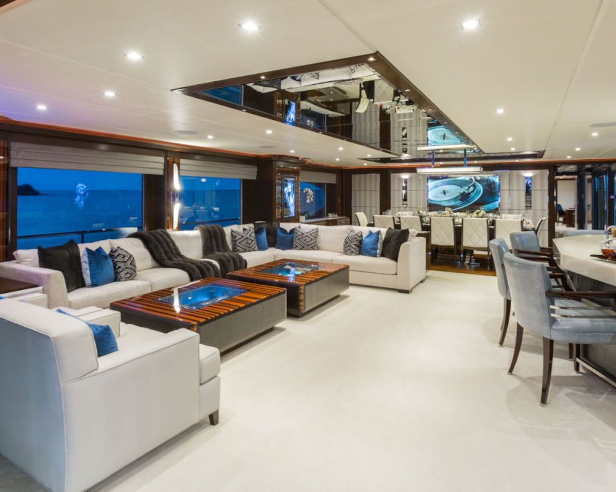 Her main salon features a plush lounge suite with custom-designed coffee tables, easily seating all 12 guests in comfort. On the port side is a white onyx bar with custom oversized leather chairs.