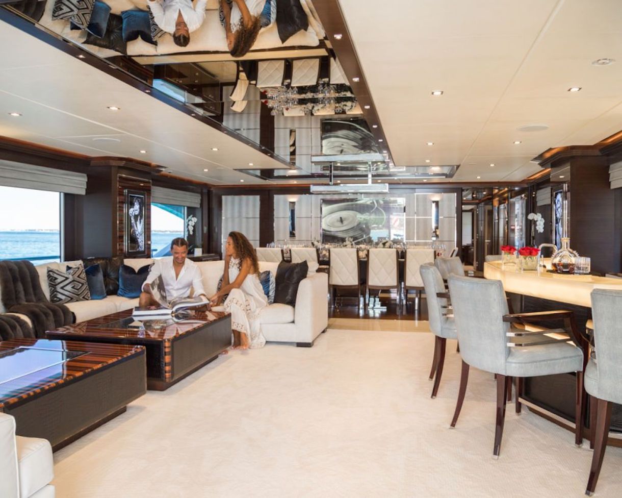 Her main salon features a plush lounge suite with custom-designed coffee tables, easily seating all 12 guests in comfort. On the port side is a white onyx bar with custom oversized leather chairs.