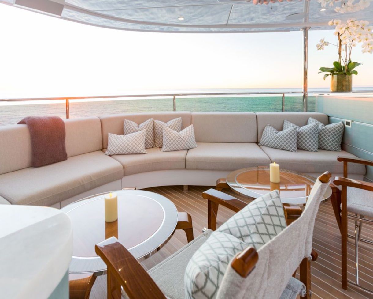 Her main salon features a plush lounge suite with custom-designed coffee tables, easily seating all 12 guests in comfort. On the port side is a white onyx bar with custom oversized leather chairs.