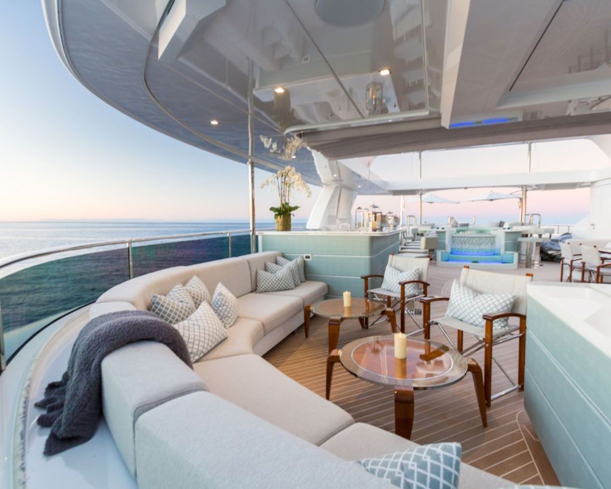 Views from the salon and sky lounge are limitless thanks to panoramic windows. Guest accommodation includes a full-beam master suite on the main deck, along with two double and two twin cabins with Pullmans on the lower deck.