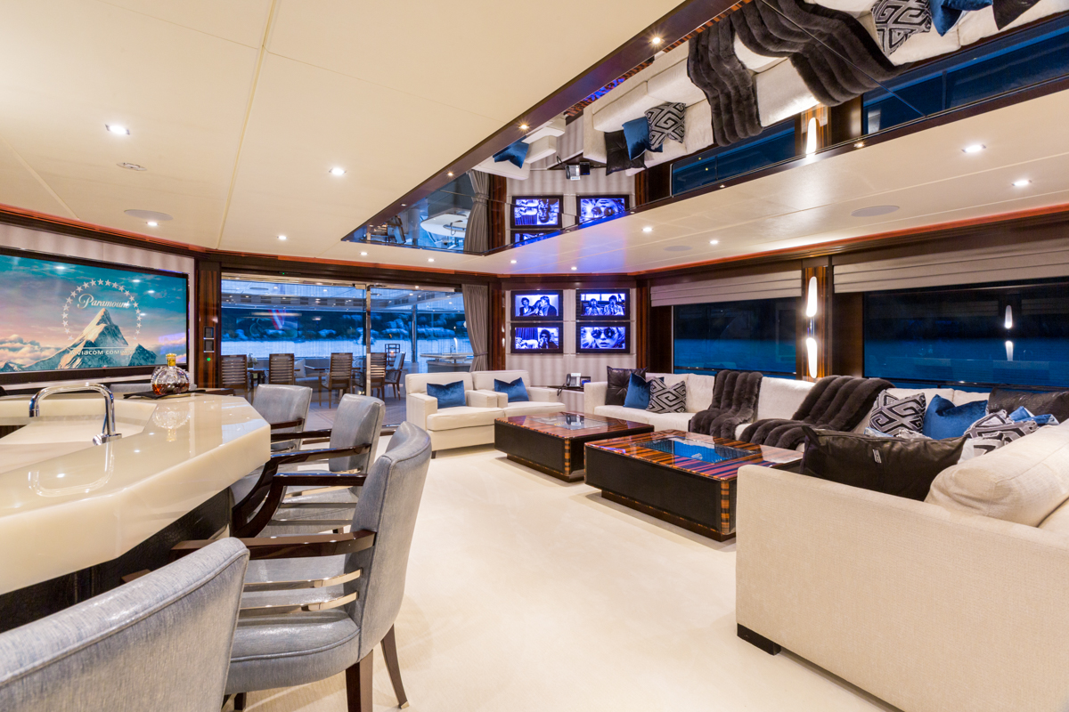 Her upper sky lounge is well-appointed offering a generous U-shaped sofa, coffee table and white granite wet bar with seating.