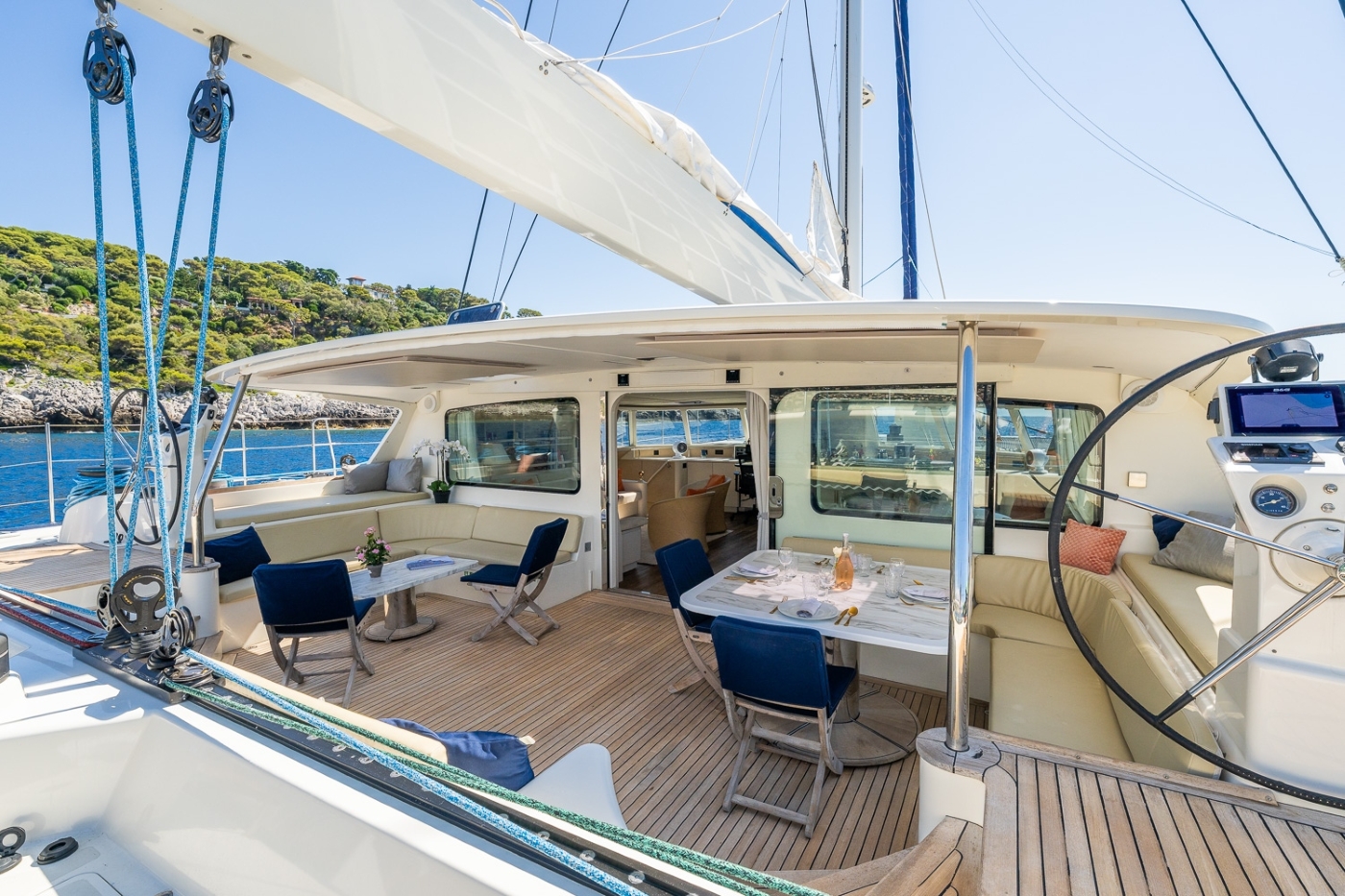 Her wide saloon is airy and bright. There is a cosy lounge area, modern furnishing, chairs, bar and A/V entertainment system. Alfresco dining area is located aft and offers two table and comfortable seating.