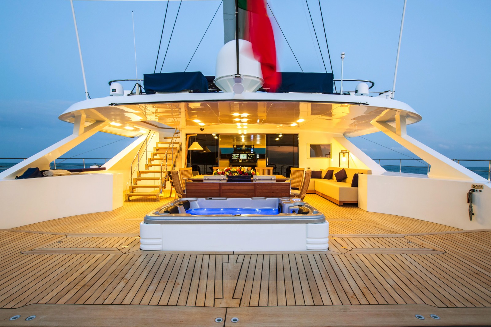 The aft deck exterior saloon is a great social gathering area boasting a large shaded terrace with a lounge area, an al-fresco dining area and a spacious sunbathing area.