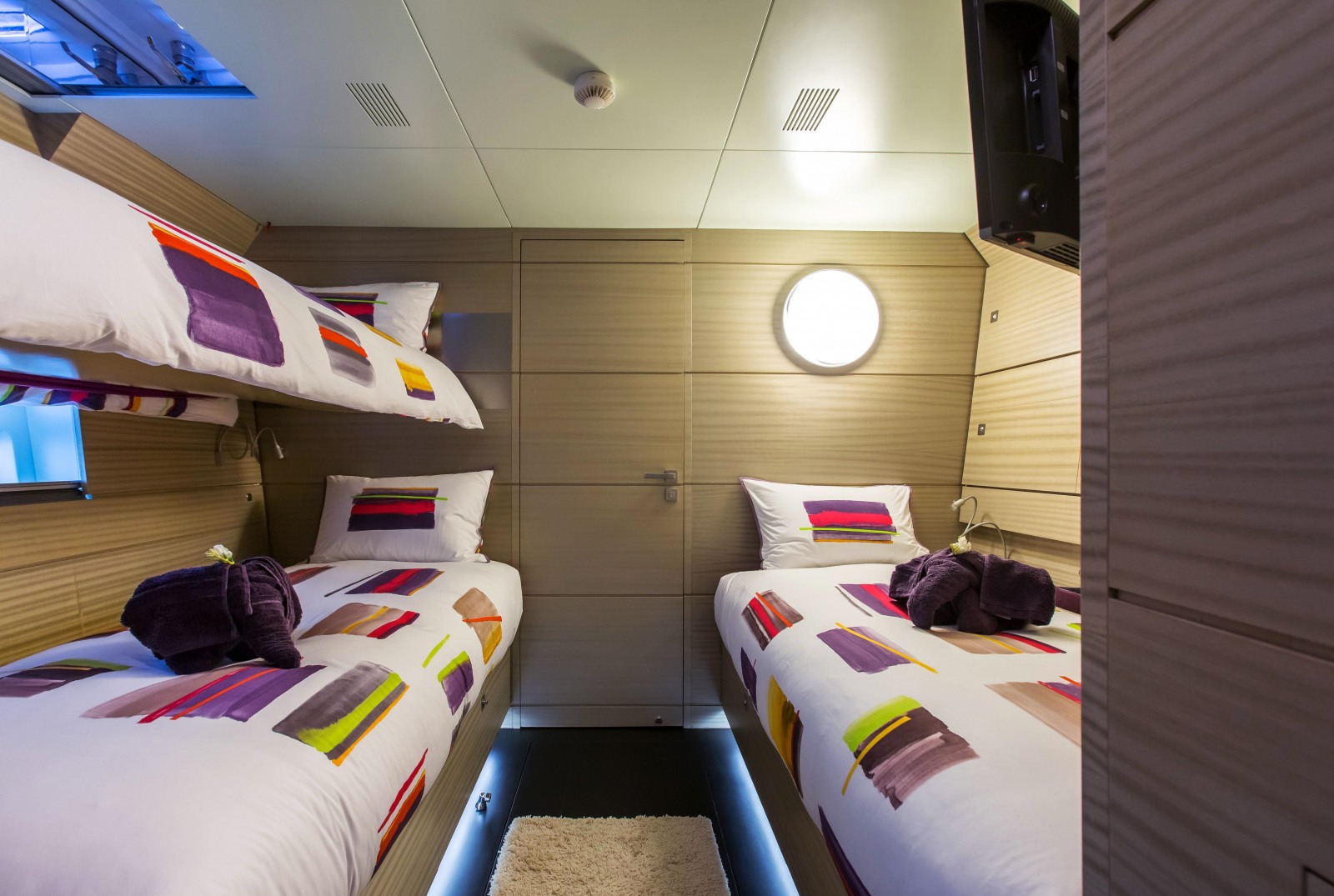 The two remaining guest cabins are located in the starboard hull are smaller than the master cabin but still spacious and very comfortable and with en-suite bathrooms.