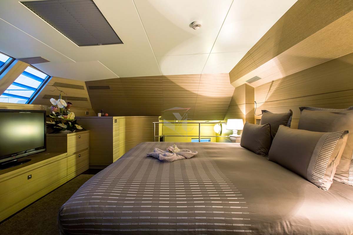S/Y HUTIANE can comfortably accommodate 10 guests in 4 staterooms and has a professional crew of five to cater to every desire. Her huge master stateroom offers 180 degree views over the bow of the yacht and is beyond. The master stateroom offers also a third berth ideal for a child, on the lower level, and a spacious bathroom with hammam.