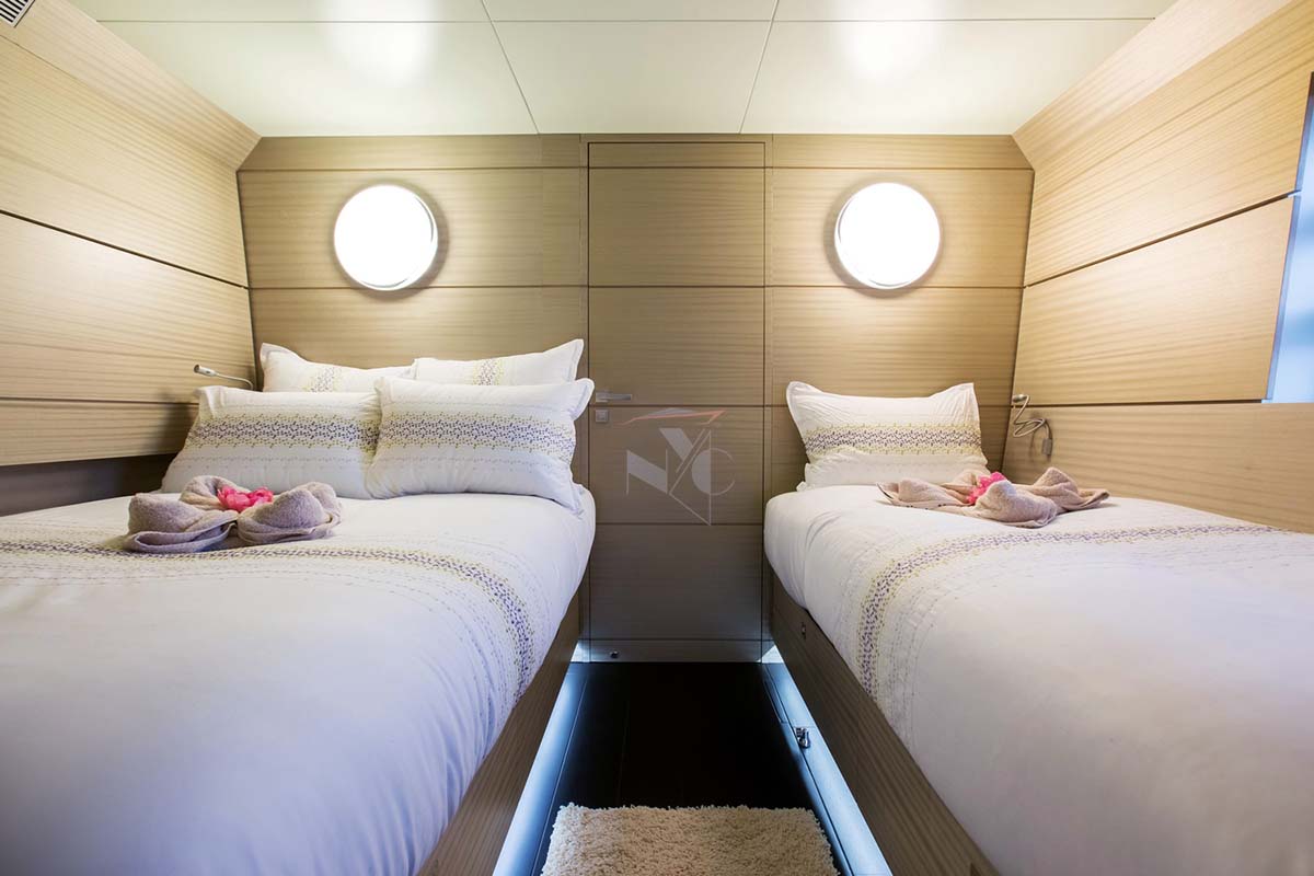 The two remaining guest cabins are located in the starboard hull are smaller than the master cabin but still spacious and very comfortable and with en-suite bathrooms.