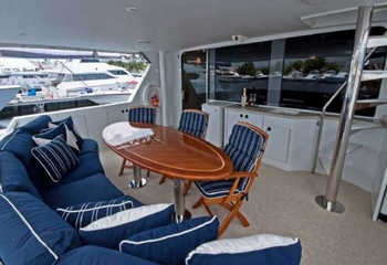 On Deck motor yacht MIZ DORIS III provides plenty of space to lounge, the aft deck is shaded and boasts an alfresco dining option, comfortable seating with mini wet bar leading directly from the salon. Motor yacht MIZ DORIS III has a wonderful fly bridge complete with large sunpads, a Spa Pool tub, drinks bar and optional shade if required.