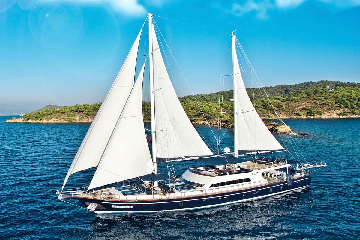 Turkish gulet MASKE II is a 2013 luxury sailing yacht available for charters around Turkey. Measuring 28m in LOA, the superyacht MASKE II was designed by Kerim Acar and features accommodation to 12 guests in total and has a crew of four.
