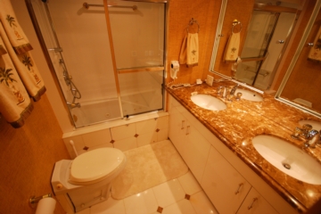 The aft of the salon hosts the lounge area which consists of a large settee to port and an entertainment center to starboard; forward of this the formal dining area features a round marble table for 6, the galley is beyond this ...
