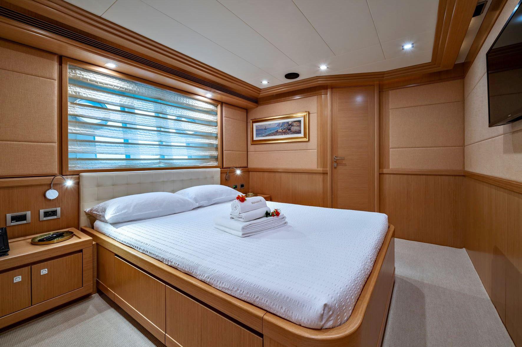 The yacht measures 26,22m (86’) and is great for larger family groups or friends as she can accommodate up to 12 guests in 5 cabins.