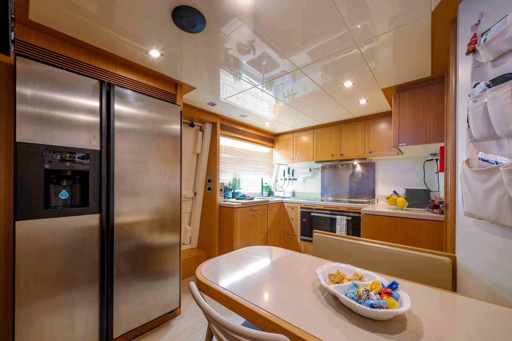 She features large windows enabling natural light to filter into the living area and to every cabin, natural woods and leathers, a sky lounge on the upper deck and a large cockpit furnished with an extendable table.