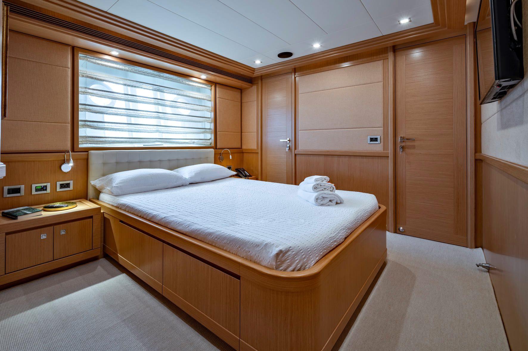 She can accommodate 12 charter guests in 5 cabins including the owner's suite on the main deck forward plus 4 cabins on the lower deck including two doubles aft and two twin cabins with a Pullman bunk.