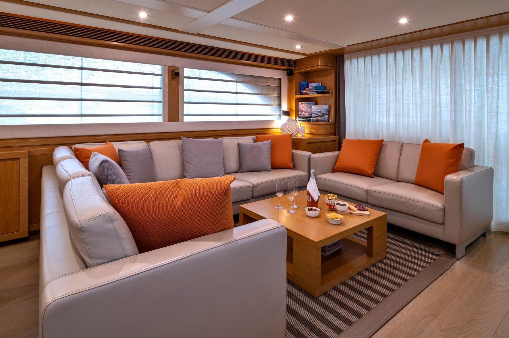She features large windows enabling natural light to filter into the living area and to every cabin, natural woods and leathers, a sky lounge on the upper deck and a large cockpit furnished with an extendable table.