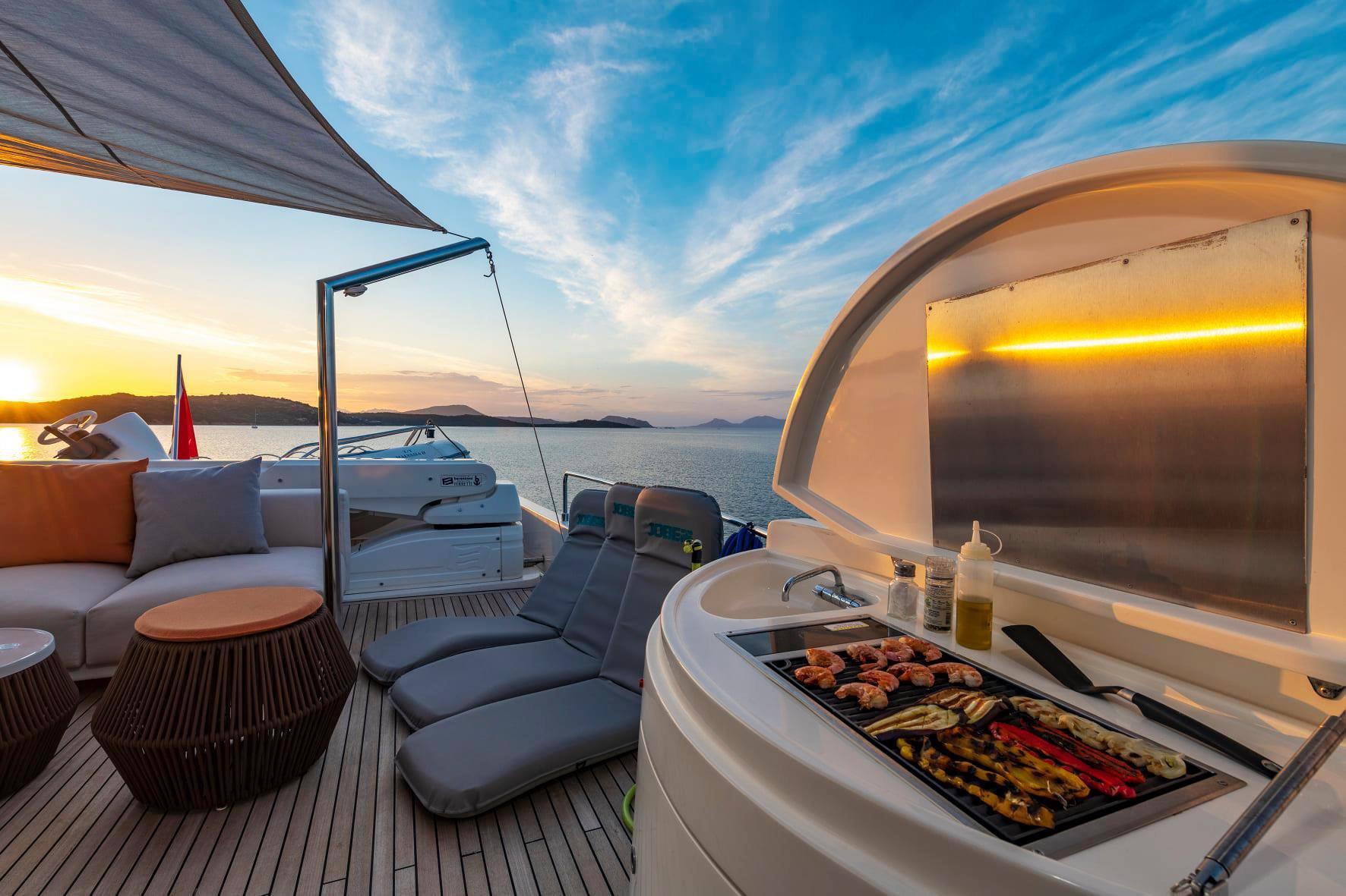 The yacht measures 26,22m (86’) and is great for larger family groups or friends as she can accommodate up to 12 guests in 5 cabins.