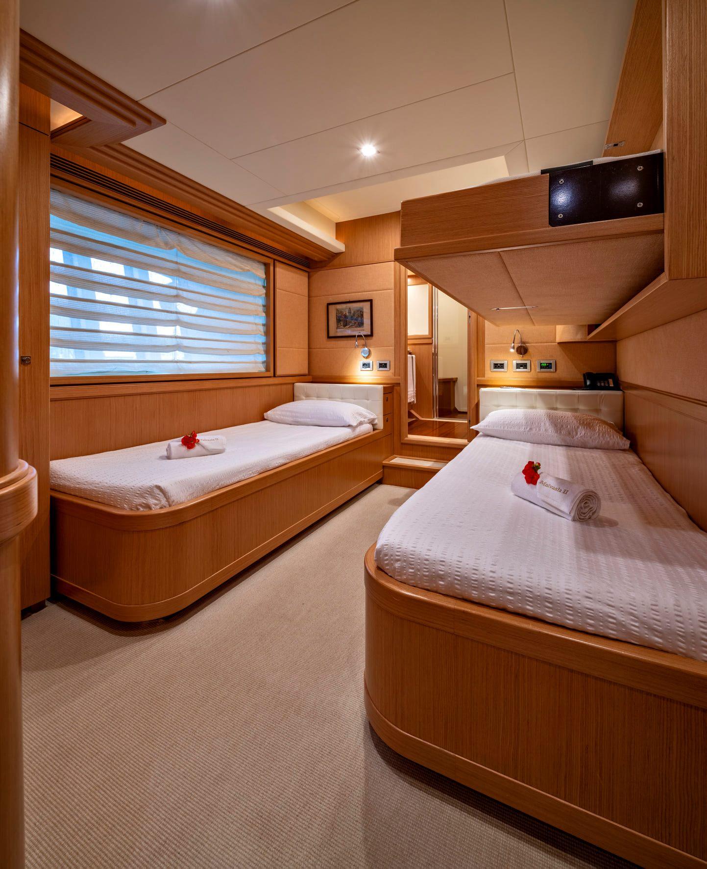 The yacht measures 26,22m (86’) and is great for larger family groups or friends as she can accommodate up to 12 guests in 5 cabins.