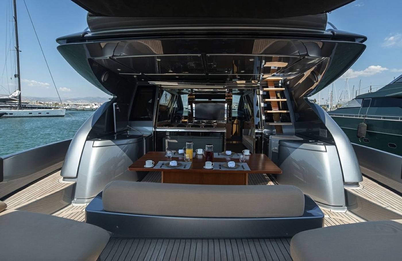 Her aft deck offers a relaxed sunbathing/seating area as well as an alfresco dining area for up to 8 guests. The superb design continues with a retractable glass window that opens the space between the aft deck and saloon.