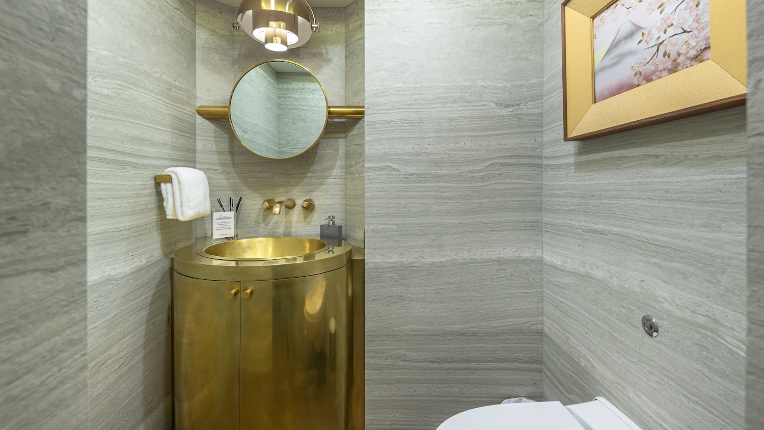 On the starboard side, a foyer leads to the guest day head and main entrance. Her VIP cabin is on the main deck starboard side, followed by the full-beam master stateroom on the main deck forward. Additional accommodation is below decks, in 4 ensuite cabins.