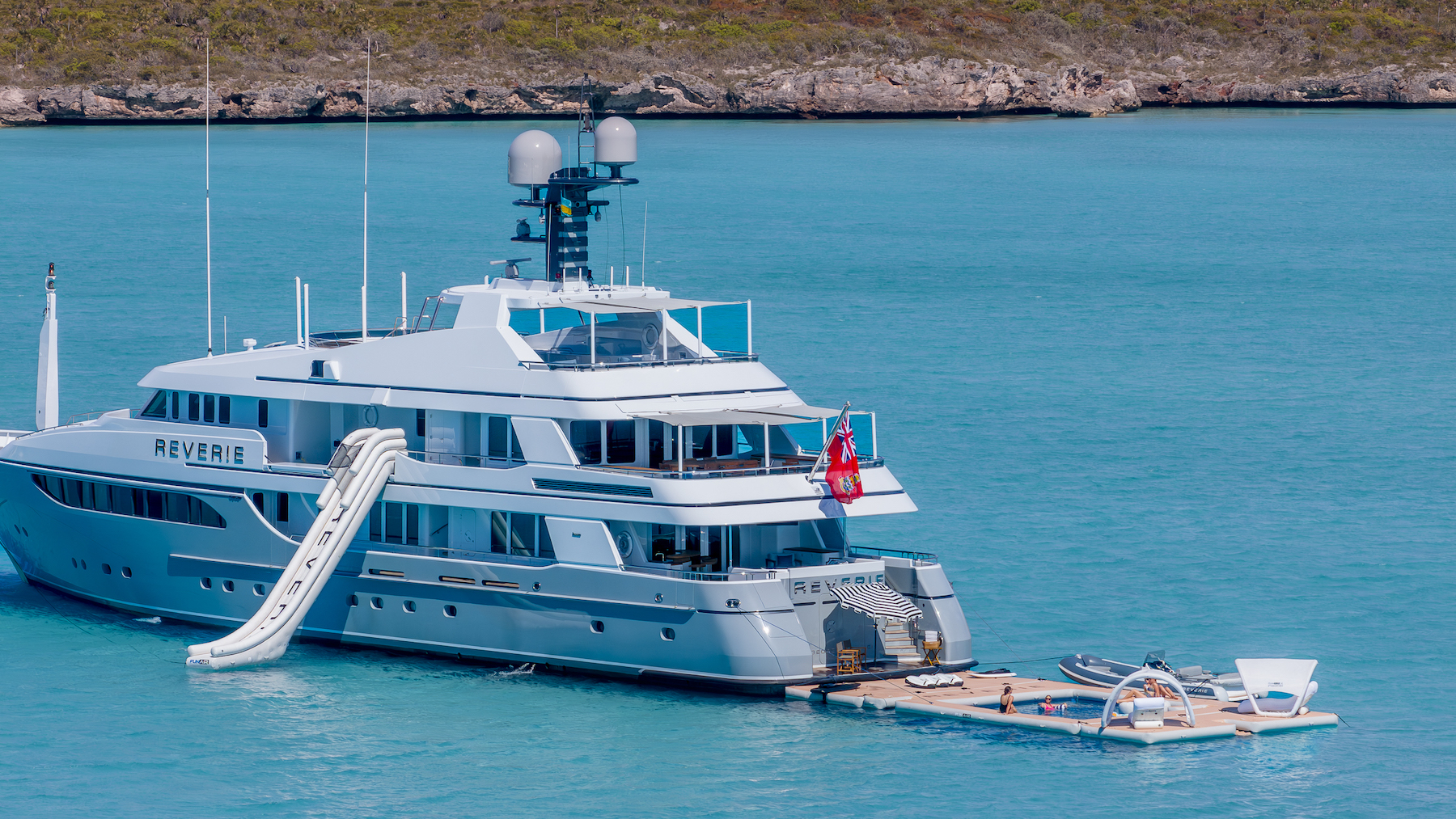 Luxury Yacht REVERIE At Anchor With The Inflatable Pool And Sunbathing AreaPhoto credit Yachting ImageAbout REVERIE ...