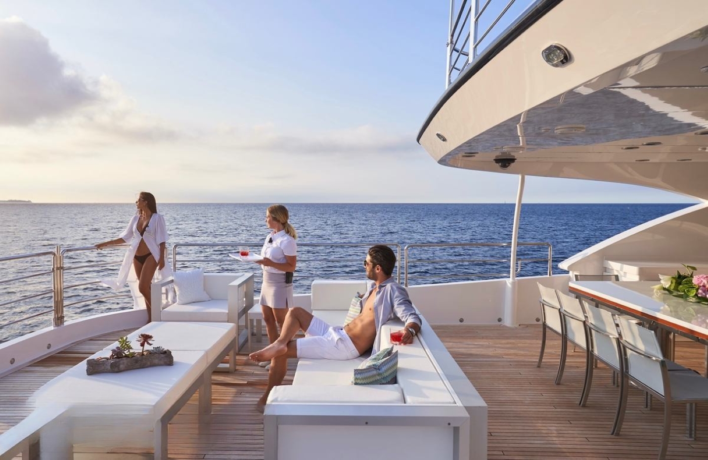 Exterior living aboard this motor yacht is plentiful and is spanned over three decks. The main deck has a shaded alfresco dining option and direct access to the salon. An extended swim platform is easily reached from port and ...