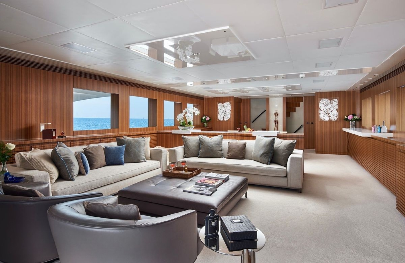 The salon and dining are on the main deck in an open plan, with two plush sofas, two occasional chairs, a large ottoman and full entertainment systems aft. A low island credenza gives a slight separation to the formal dining area forward.